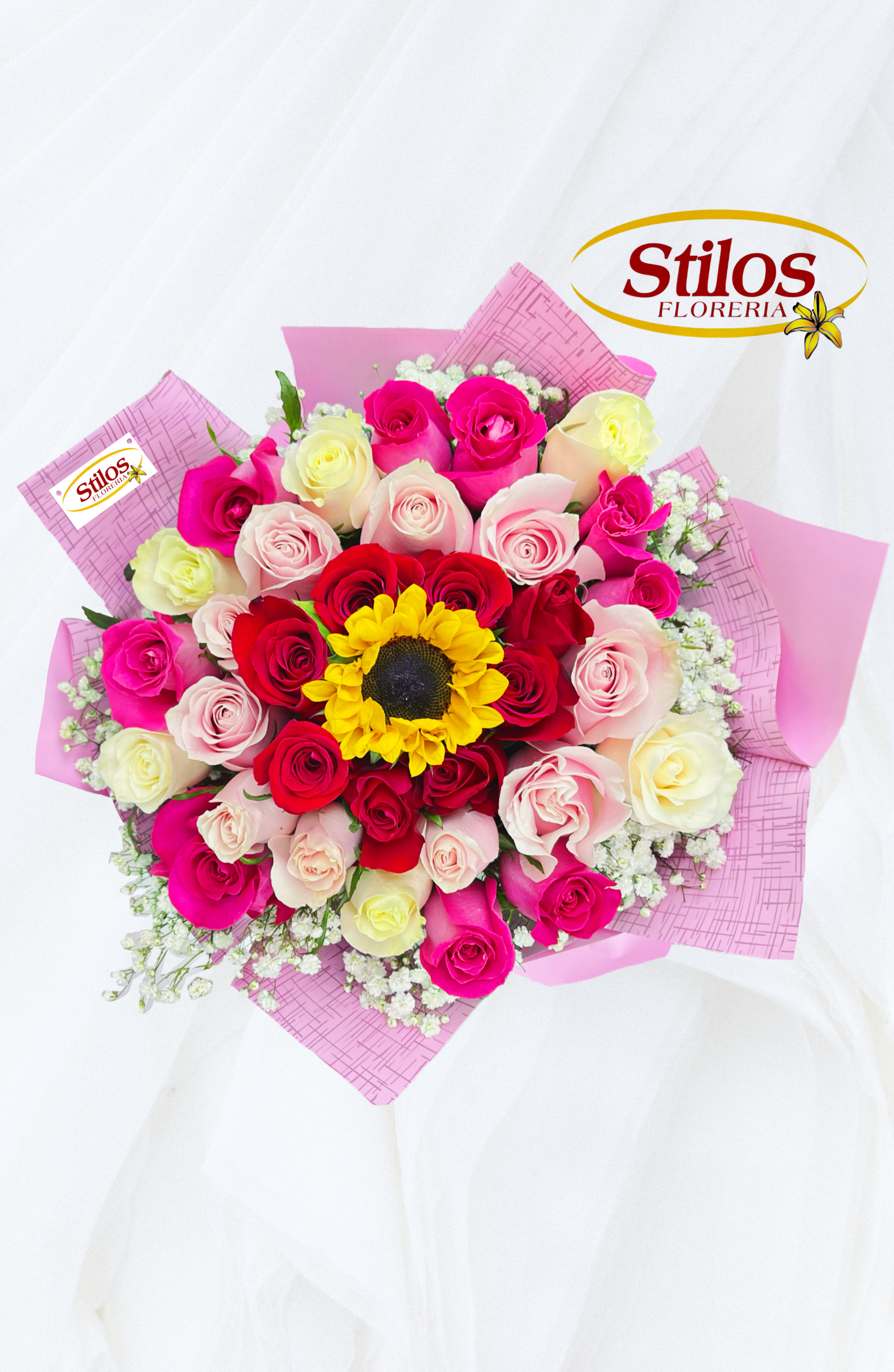 Bouquet de rosas mixtas con envoltura de papel coreano y en el centro un girasol.