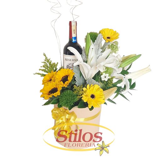 Arreglo floral con vino en una caja cilíndrica , girasoles y lirios.