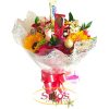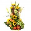 Arreglo floral con girasoles, rosas, flores de verano y 6 manzanas.