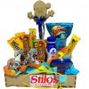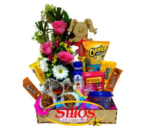 Detalle con flores, 5 fresas achoclatadas, Bon o Bon mini, Manicho mini, choco m&m mini, caja Mc Dougal mini, Gela Toni mini, Yogourt Tony, Fritolay mini en caja de madera decorativa, motivo niña, cubierto en papel celofán y lazo.