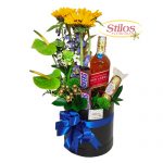 Detalle floral con whisky Johnnie Walker. chocolates Sneeker y Chocolates ferrero rocher.