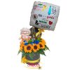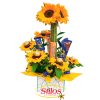 Arreglo floral con girasoles en base de decorativa .