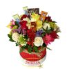 Arreglo floral con girasoles, rosas, lirios y flores de verano con deliciosas frutas de temporada.
