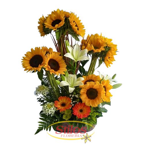 Arreglo floral con girasoles , gerberas y flores de verano.