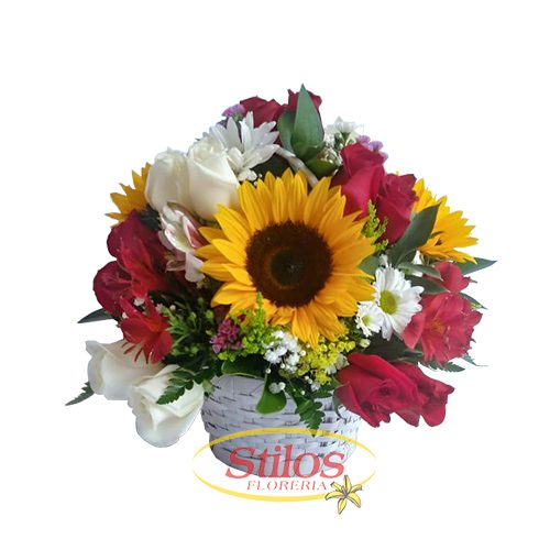 Arreglo floral con rosas en varios tonos, girasoles y flores de verano en cesto.