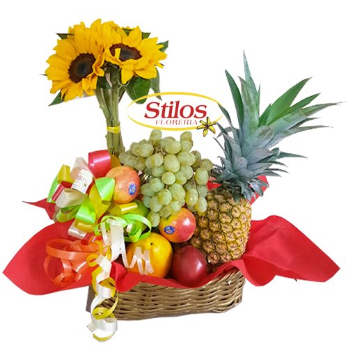 Hermoso cesto con girasoles y frutas, piña 1, papaya mini 1 , manzana verde 4, roja 4, un racimo uva verde y naranja americana ( Si por temporada no hay una cierta variedad de fruta se reemplazará por otra.