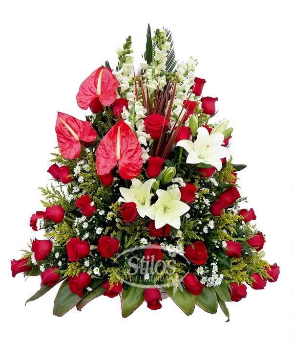 Diseño floral con rosas,lirios en elegante base decorativa en forma de corazón